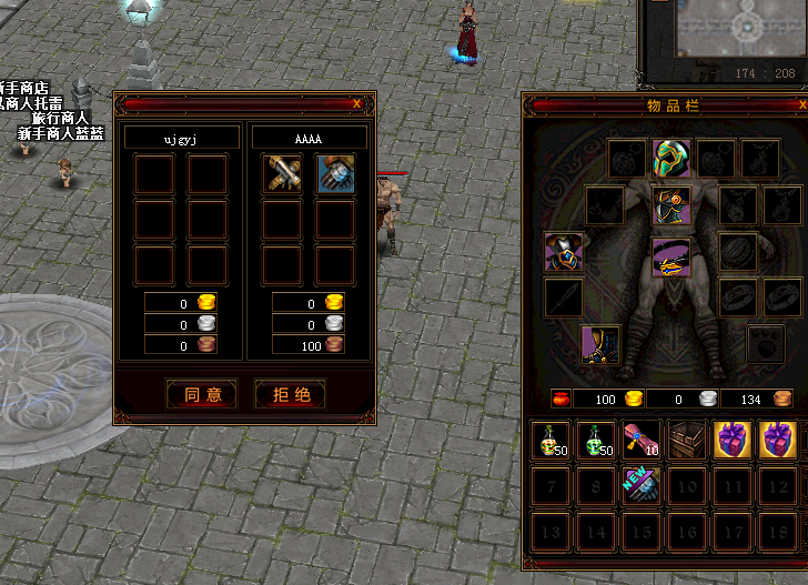 左键点击下背包中的装备拖入交易栏,游戏币交易直接在交易栏输入金额数量,双方同意后完成交易